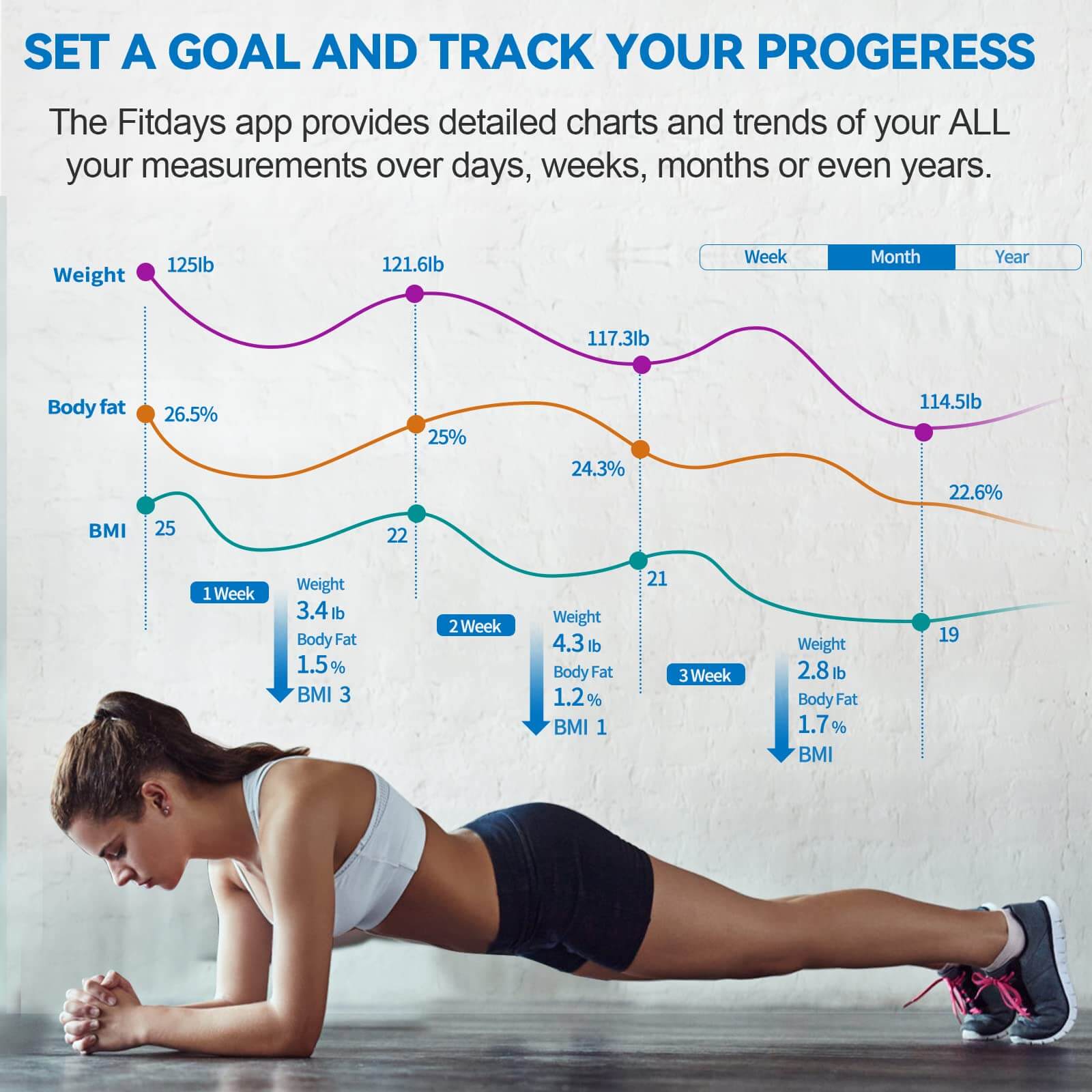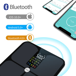 Állítson be célokat és kövesse nyomon előrehaladását adatgrafikonokkal. Töltse le a „Fitdays” alkalmazást az App Store vagy a Google Play áruházból. A testzsírmérleg Bluetooth-on keresztül szinkronizálja az adatokat okostelefonjával.